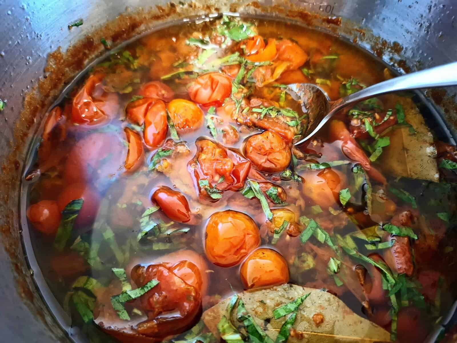 Hint: Alternatively this stovetop tomato confit can be made in the oven 120 degree Celcius (250 degree Farenheit). Just put all the ingredients in an oven proof dish instead and cover it with a lid or tin foil